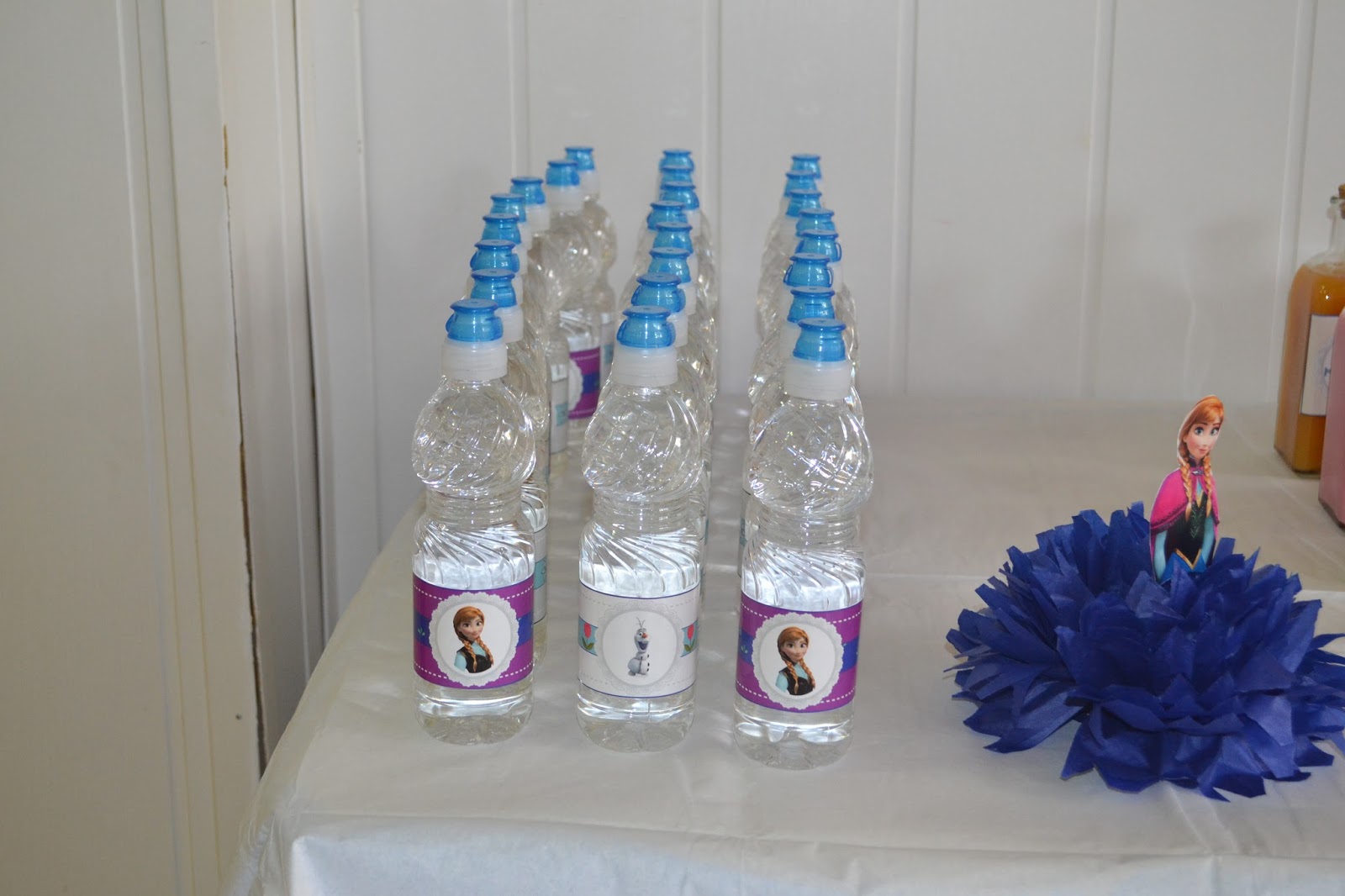 Con respecto a la mesa de menaje puse en un lado las bebidas, agua, fantas, zumos y batidos. Seguidamente los platos cubiertos y vasos, encima de estos últimos una corona de princesas, delante las servilletas que tenían a ambas princesas, Elsa y Anna.